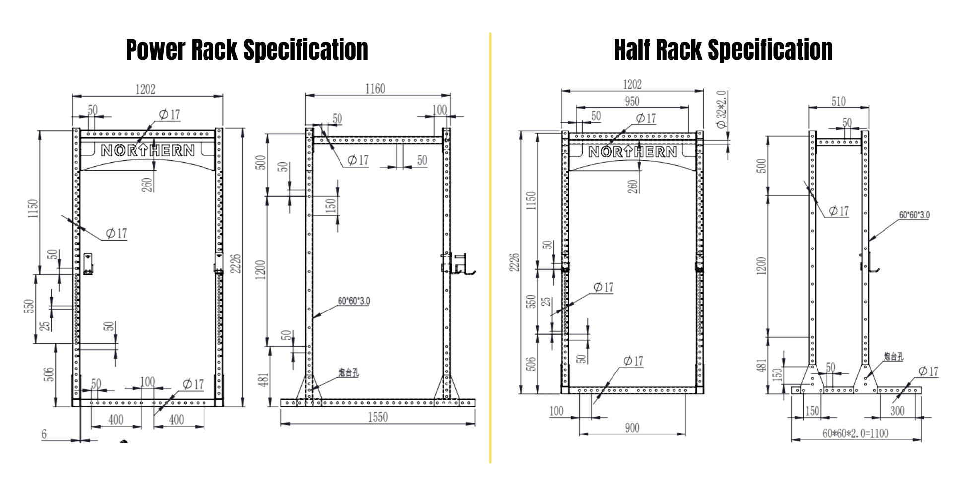 - Hole Spacing: 50mm standard spacing; 25mm Westside spacing through bench press zone