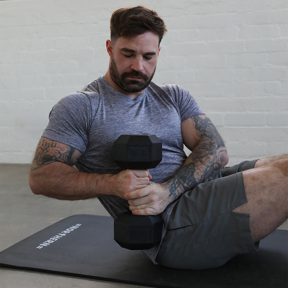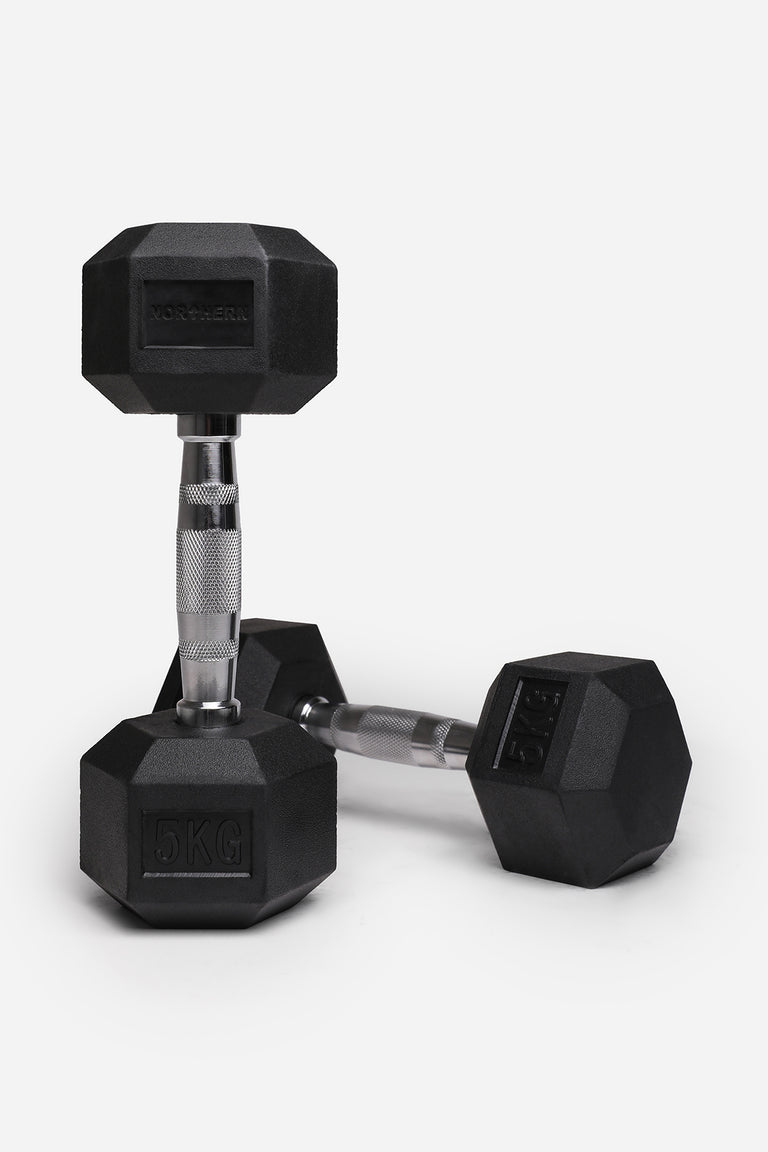 The Northern 5-15kg rubber hex dumbbell set, comes in pairs of dumbbells in 2.5kg increments. In this set you will receive a pair of each of: